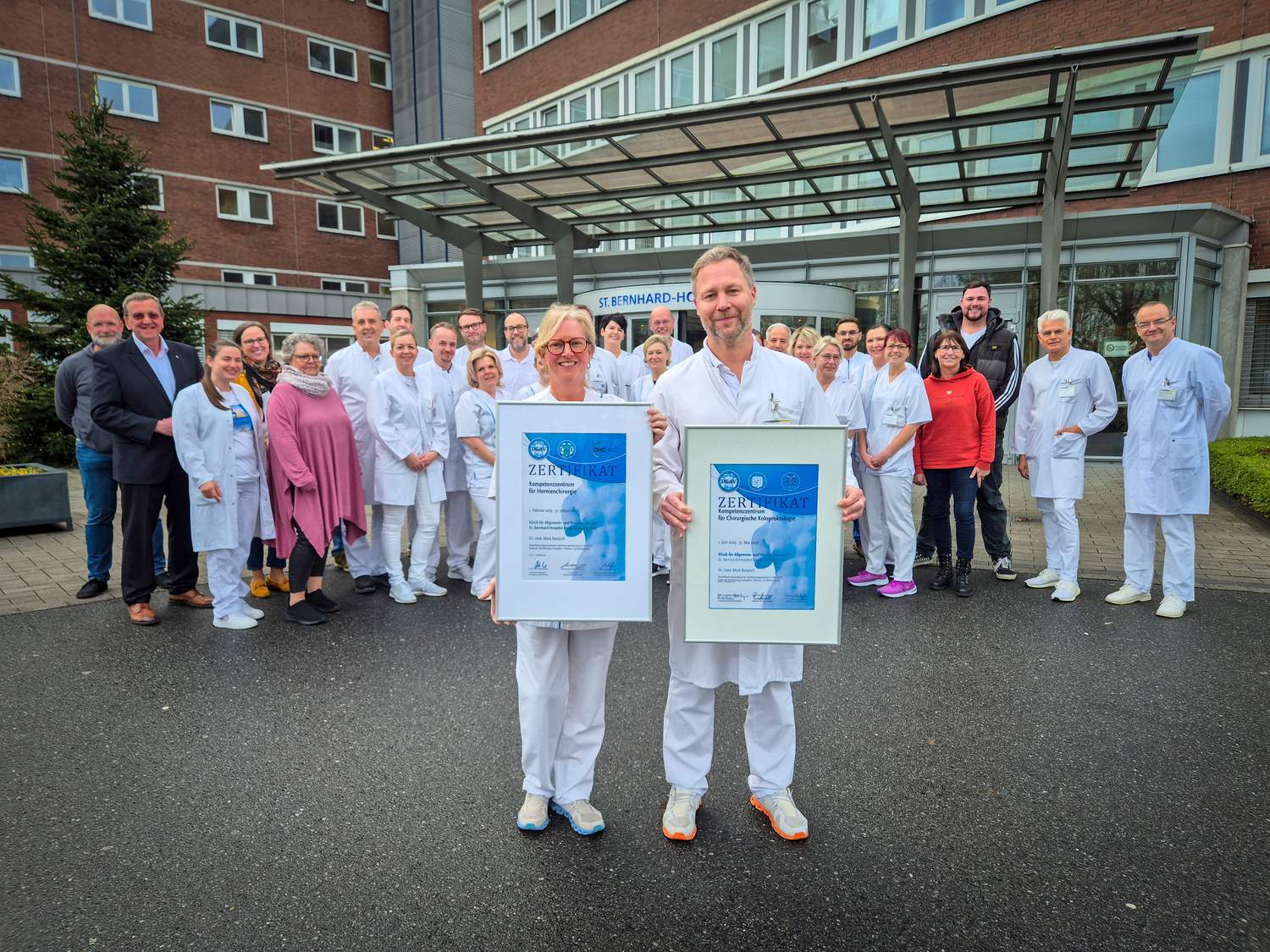 Kamp-Lintfort. Doppelter Grund zur Freude in der Klinik für Allgemein- und Viszeralchirurgie des St. Bernhard-Hospitals Kamp-Lintfort: Das Team um Chefarzt Dr. Mark Banysch wurde erneut von der Deutschen Gesellschaft für Allgemein- und Viszeralmedizin (DGAV) ausgezeichnet. Mit den Rezertifizierungen als Kompetenzzentrum für Koloproktologie und Hernienchirurgie unterstreicht die Klinik ihre hohe Versorgungsqualität sowohl bei Dick- und Enddarmerkrankungen als auch bei Bauchwandbrüchen. Beim umfassenden Doppelaudit prüften Fachexperten der DGAV unter anderem Strukturen, Abläufe, Fallzahlen und spezielle Qualitätsindikatoren, wozu auch besonders anspruchsvolle Operationen zählen. Das erfreuliche Ergebnis: Es sind keine Qualitätsabweichungen festgestellt worden.