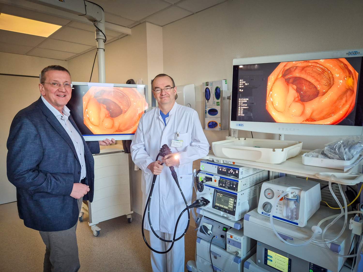 Kamp-Lintfort. Das St. Bernhard-Hospital Kamp-Lintfort erhöht den Qualitätsstandard in der medizinischen Diagnostik: Mit einem neuen, hochmodernen Endoskopie-Park kann das Team der Klinik für Gastroenterologie um Chefarzt Dr. Theodor Heuer kleinste Gewebeveränderungen bei Untersuchungen der inneren Organe noch frühzeitiger, umfangreicher und genauer erkennen. Über eine Million Euro hat das Kamp-Lintforter Krankenhaus unter anderem in neue Endoskope, moderne Monitore und Prozessoren investiert. Das Besondere: Der Endoskopie-Park arbeitet mit künstlicher Intelligenz. „Unser Ziel ist es, Menschen, die eine Magen- oder Darmspiegelung zur Vorsorge, Abklärung oder aufgrund einer bereits festgestellten Erkrankung benötigen, eine optimale Diagnostik und Behandlung zu bieten“, begründet Geschäftsführer Josef Lübbers die Modernisierung.